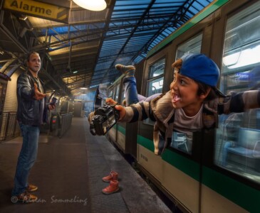 Adrian Sommeling is al jaren een bekende fotograaf binnen en buiten Nederland. Zijn zoontje heeft in die jaren ook al heel wat wonderlijke avonturen beleefd. Van kattenkwaad tot het bereiden van neushoorns, Nic heeft het allemaal al meegemaakt! De afbeelding waar hij bij mij bekend mee geworden is zie je hieronder. Nic wordt uit zijn schoenen getrokken en meegesleept in de metro van (volgens mij) Parijs. Waar gaat deze reis naartoe? De werken van Sommeling zijn altijd iet wat schilderachtig. Echter past dit perfect bij de "fantasy"-stijl die hij neer zet.
